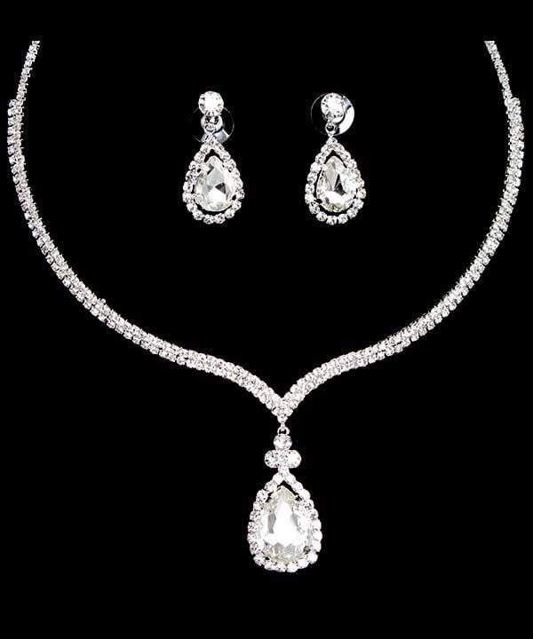 Silver Rhinestone w/Clear Tear Drop Necklace Set