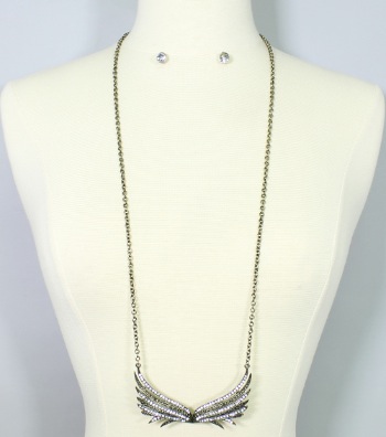 Silver w/Black & Clear Color Wing Pendant on Long Chain Necklace