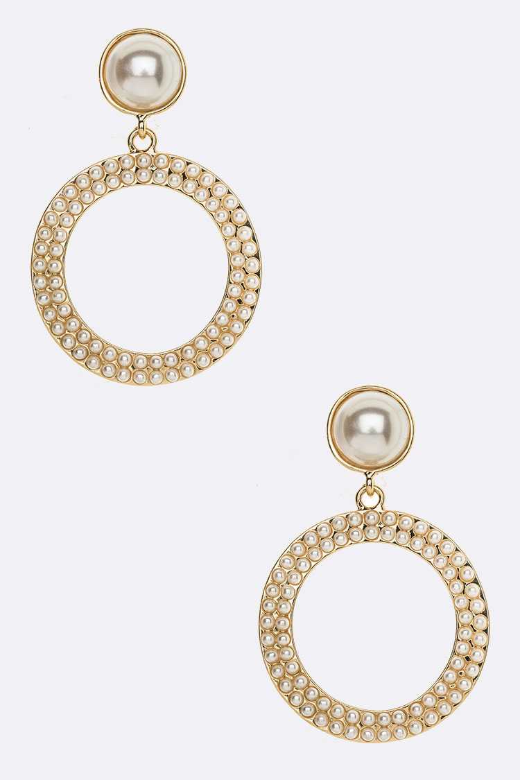 Gold w/Cream Pearl Pave Hoop Drop Earrings