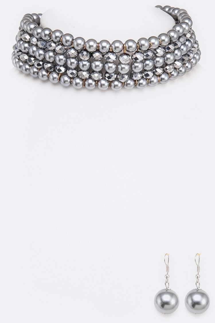 Gold w/Grey Multi Strand Pearl Choker Necklace Set